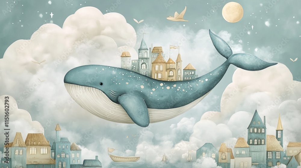 Whimsical children's illustration of a whale with a magical city on its back soaring through the sky. Perfect for nursery decor or kids' room wallpaper #1151602793