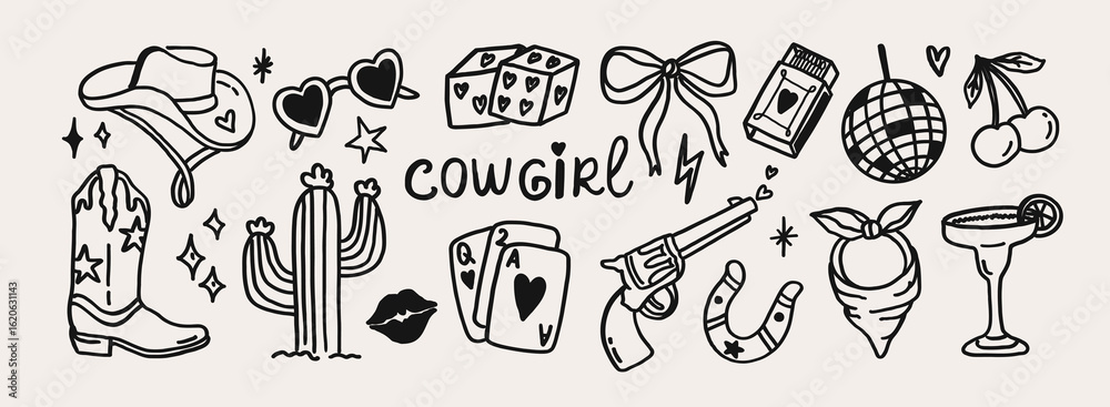 Whimsical cowgirl doodle set. Vintage texas whimsy hand drawn line art western boot, hat, horseshoe, cactus elements. Coquette cute rodeo west girl vector outline illustration #1620631143