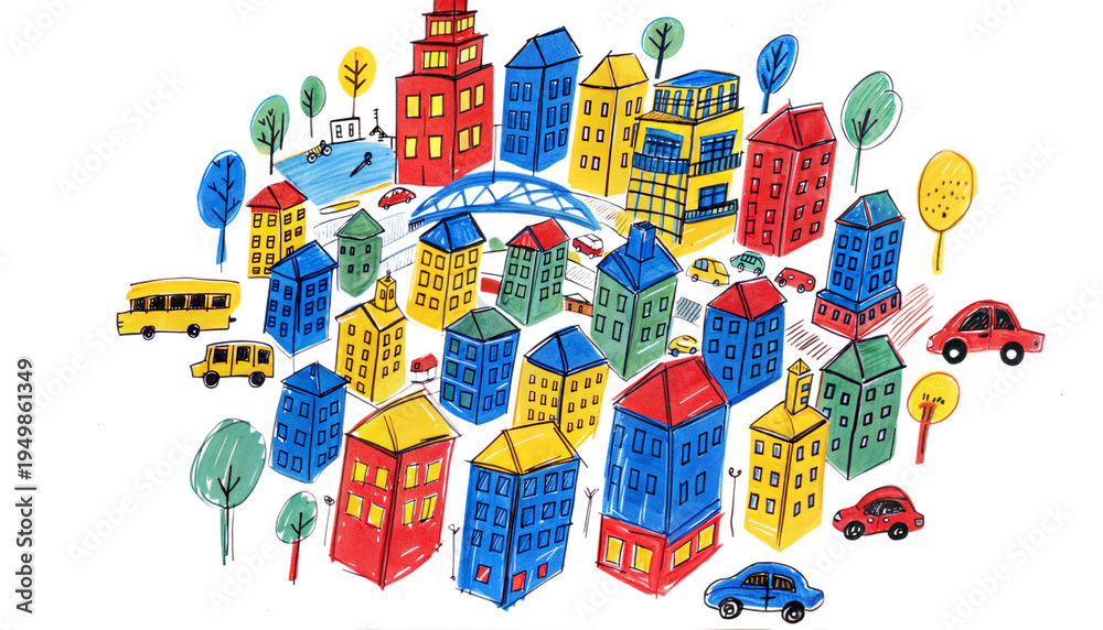 Whimsical Naive Art Cityscape with Colorful Houses, Cars, and Trees on Black Background #1949861349