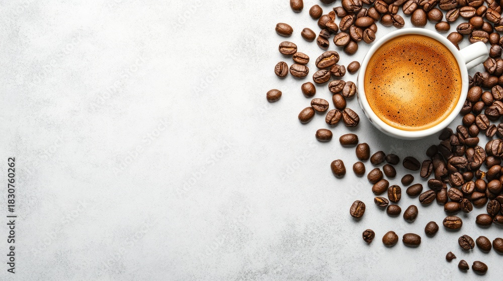 White coffee cup filled with espresso, surrounded by coffee beans on a light gray surface (1) #1830760262