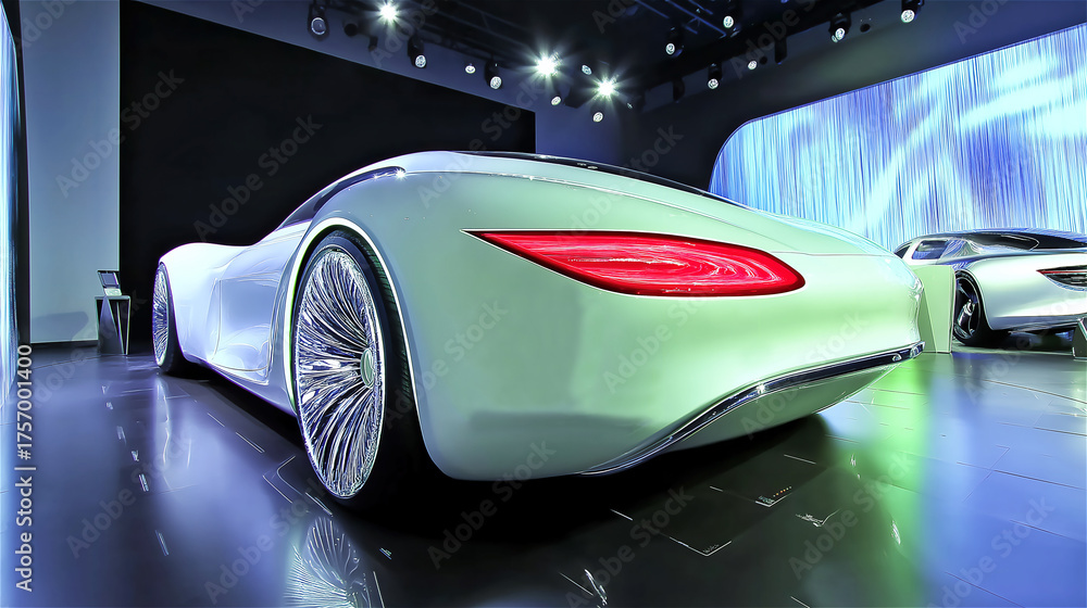 White concept sports car with red taillight displayed at auto show on reflective floor. Luxury vehicle exhibition showing sleek modern design with dramatic lighting and copy space. #1757001400