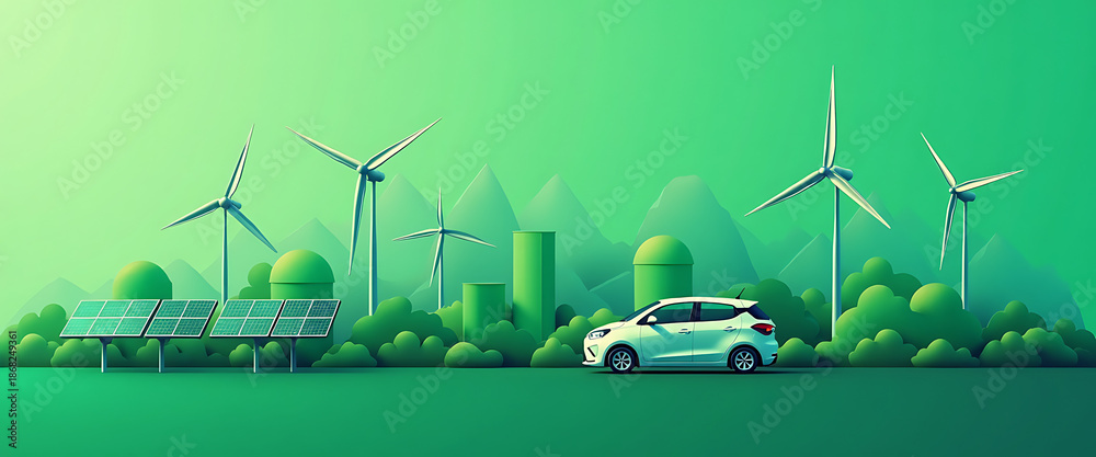 White electric car driving through a green landscape with multiple wind turbines, solar panels, and futuristic buildings #1868249361
