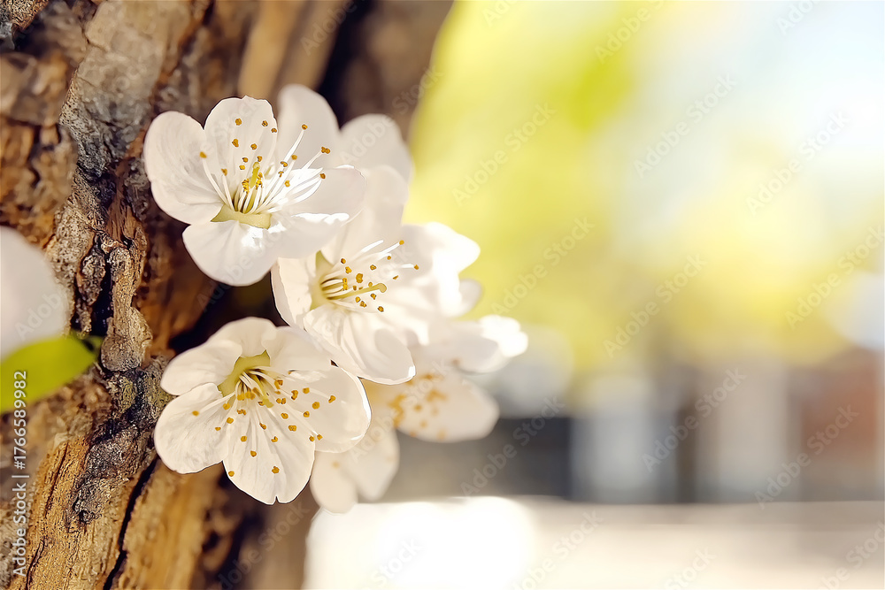 White flowers blooming on tree bark in warm spring light. Macro perspective highlights natural beauty, freshness, and simplicity with peaceful copy space on soft background. #1766589982