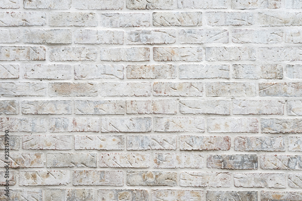 White painted brick wall full frame background with gritty textured imperfections #232157990