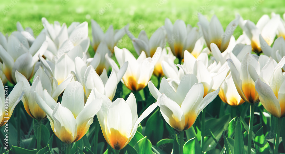 White tulips with yellow details in Amsterdam, Netherlands during Spring season. Flowers backlit and lit from the side with natural sun light on a bright sunny day. #280661540