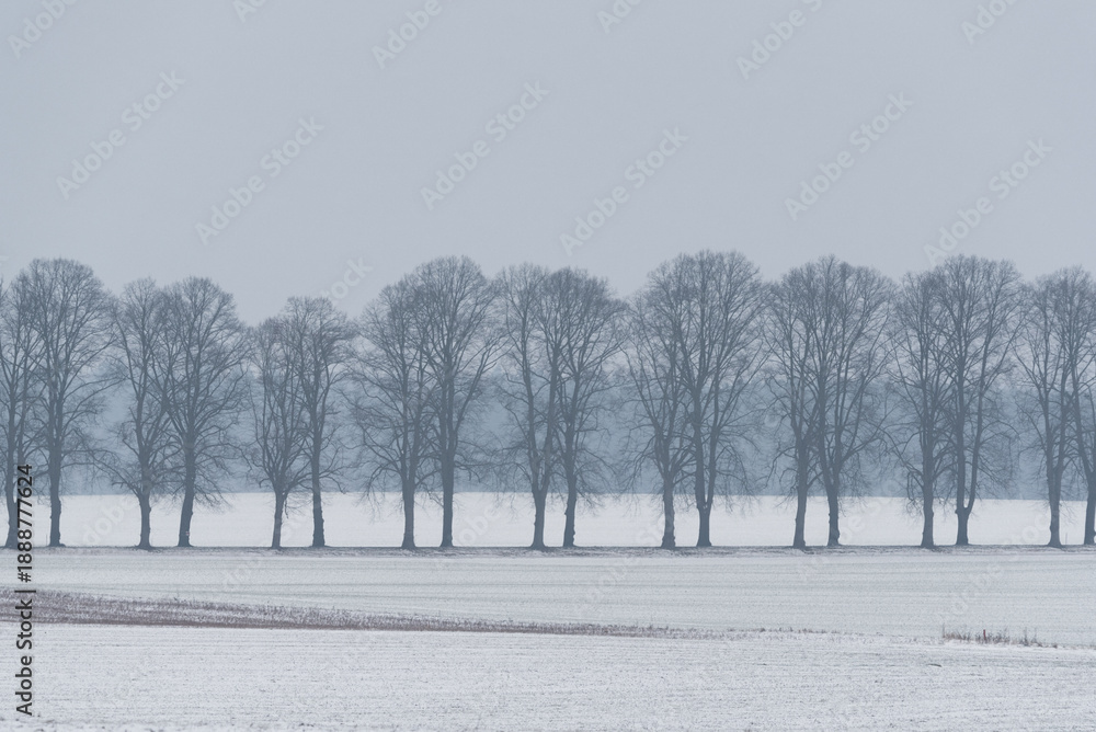 WHITE WINTER - A row of roadside trees among snow-covered fields #1888777624