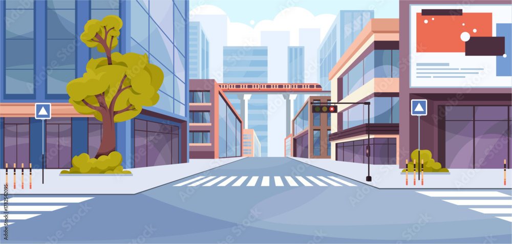Wide and empty roads in urban surroundings. Vector streets with no vehicles or pedestrians, showing clear lanes, stoplight and buildings. Peaceful city infrastructure, avenue without traffic #1782542095
