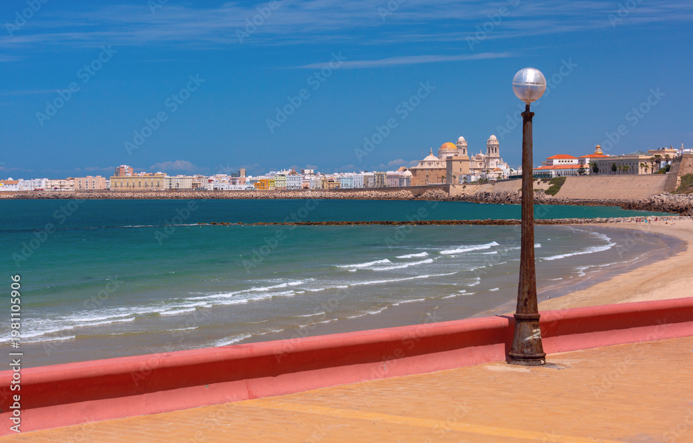 Wide coastal view of Cadiz, Spain, with sandy beach, turquoise Atlantic water, breakwaters, and the cathedral skyline under clear daylight. #1981105906