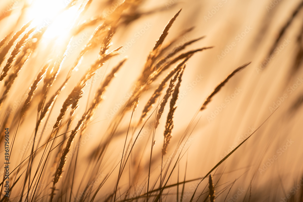 Wild grass in a summer forest against the sky at sunrise. Beautiful summer nature background. #1961756004