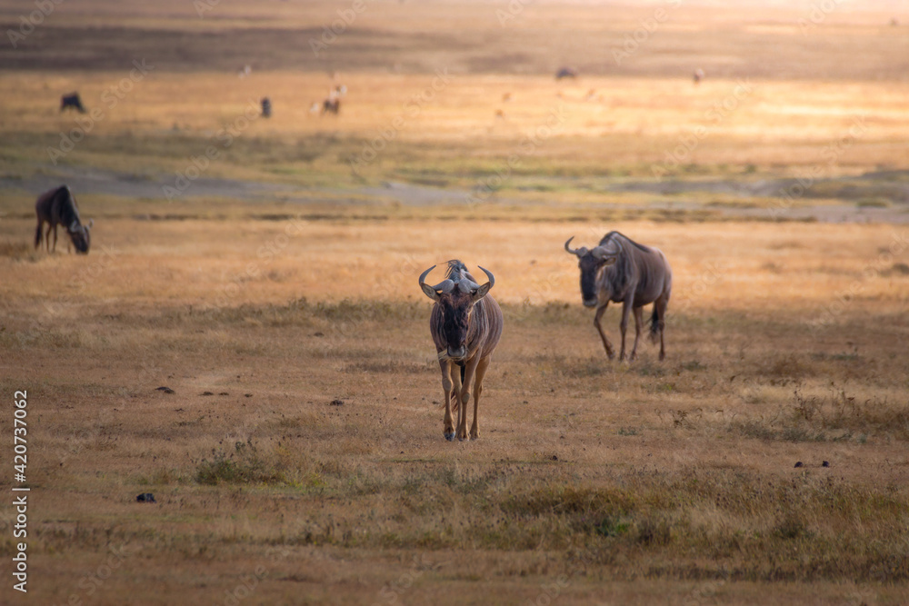 Wildebeest in the grassland of the Ngorongoro Crater Conservation Area. Safari concept. Tanzania. Africa #420737062