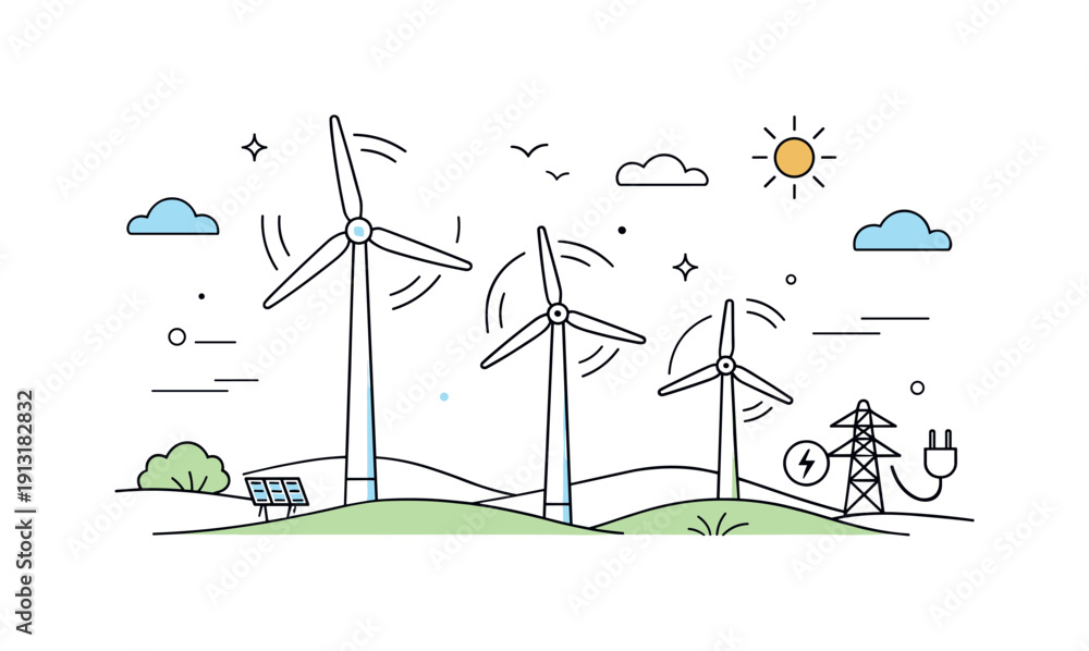 Wind Energy Progress. Renewable power . Wind turbine blades turning steadily in an open landscape, symbolizing clean electricity and progress. Calm, #1913182832