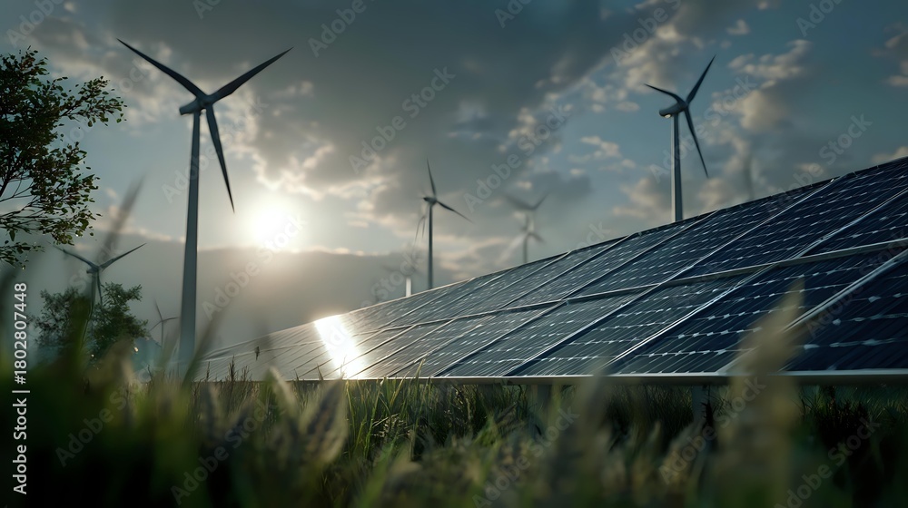 Wind turbines and solar panels in green field at sunset, showcasing renewable energy sources for sustainable power generation and environmental conservation. #1802807448