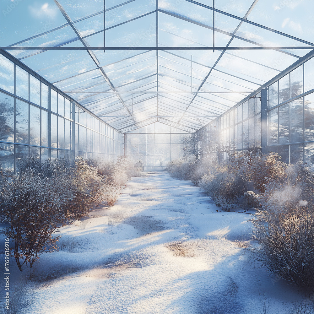 Winter greenhouse interior with snow-covered plants and light #1769616916