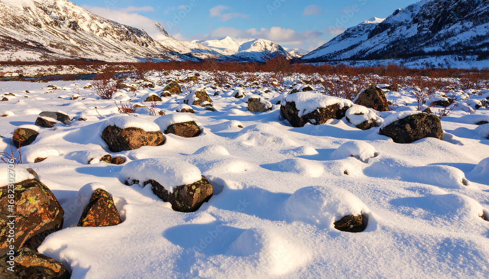 Winter landscape with snow covered rocks in a mountainous region under a sunny sky #1682302706
