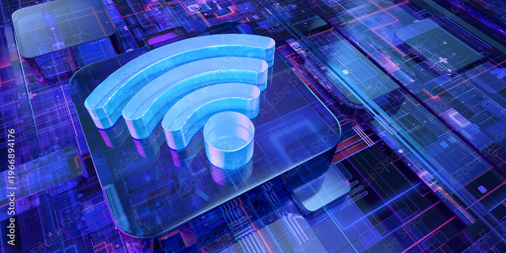 Wireless connectivity symbol: WiFi radio signal transmission indicator as a blue icon on a glass digital interface button. Electromagnetic data, electronic infrastructure, 5G 6G information exchange #1966894176