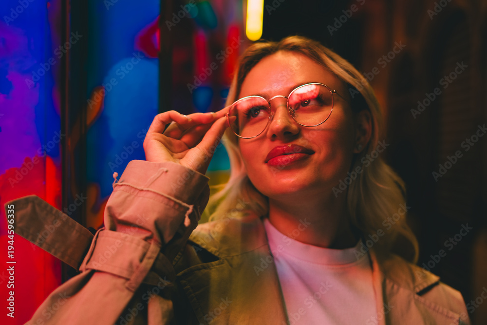 Woman adjusting glasses under vivid colored lights #1944596335