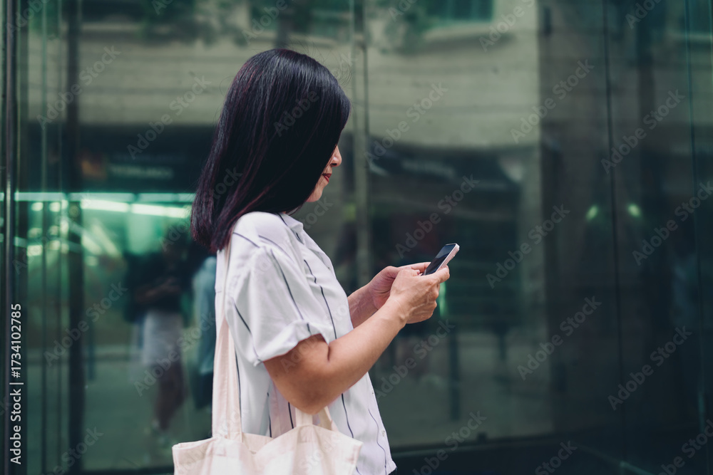 Woman checking phone mid-walk, eyes focused on screen, illustrating real-time mobile interaction, digital flow and immersive engagement with technology in everyday moment. #1734102785