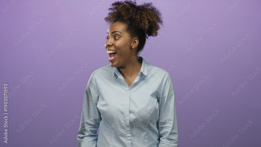 Woman laughing with open mouth and visible face, turning head to the left and gesturing with one hand in purple studio; joy optimism. #1903571893
