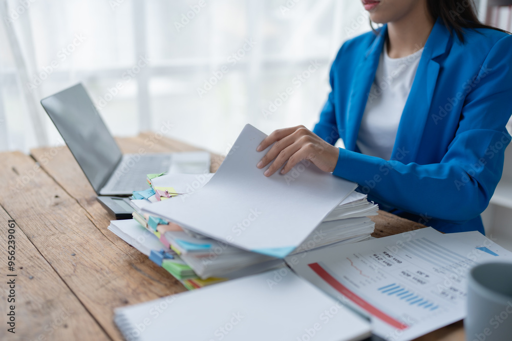 woman plans a finance and budget audit by reviewing organizing office financial documents #956239061
