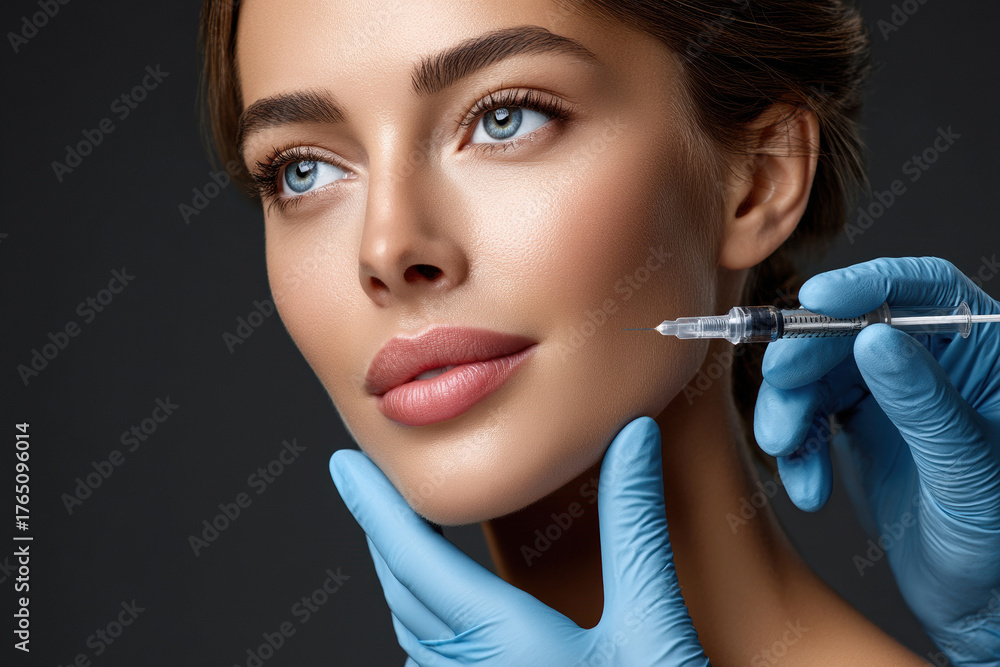Woman receiving cosmetic injection with syringe in clinic for beauty enhancement and skin treatment #1765096014