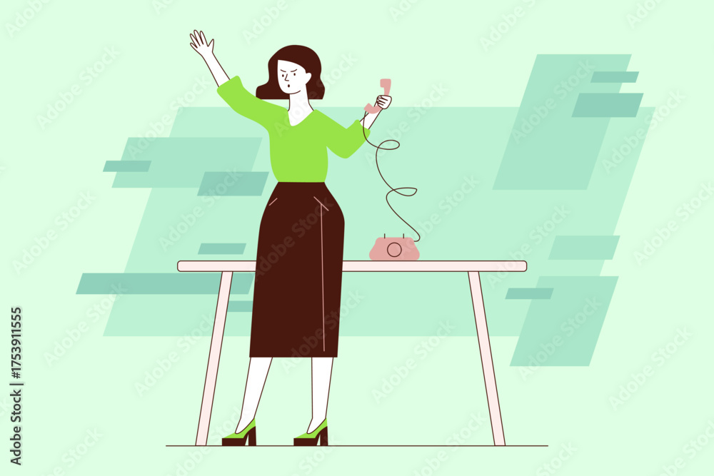 Woman standing at table, raising one hand in excitement while holding phone in other. She wearing green top and dark skirt, expressing joy in her achievement #1753911555