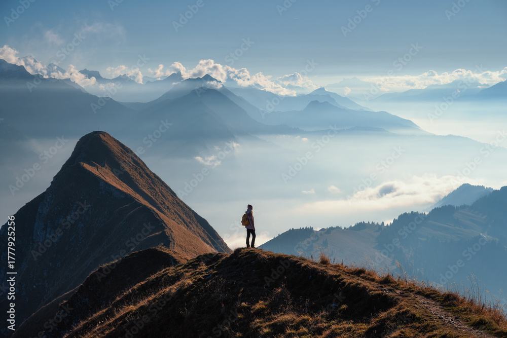 Woman with backpack standing on a mountain ridge above clouds in the Swiss Alps at sunset. Scenic view of alpine peaks, girl, mist, clear sky in fall. Concept of hiking, travel, and outdoor adventure #1777925256