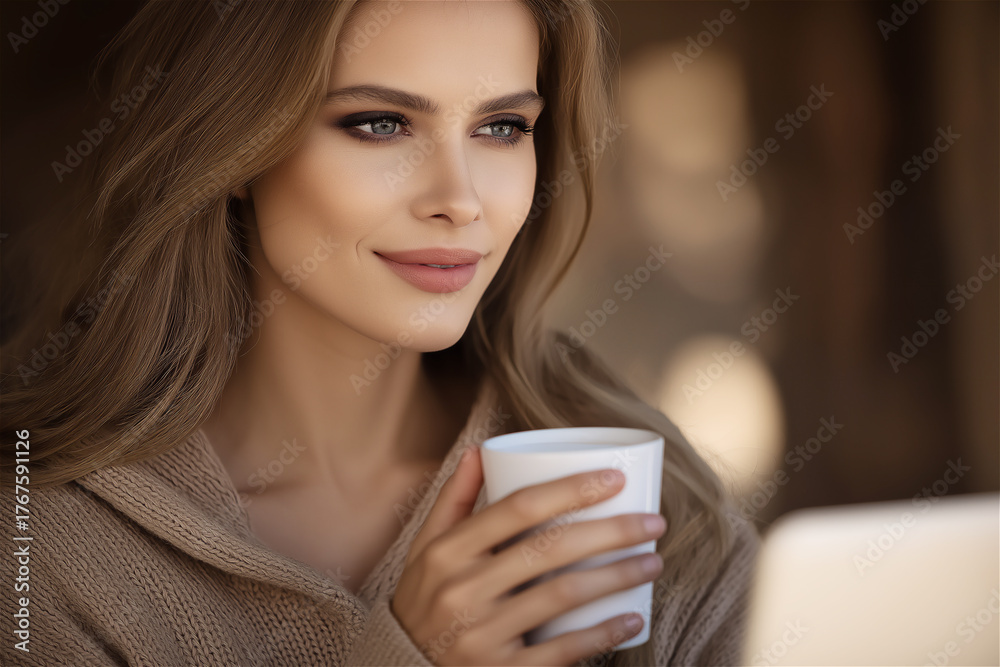 Woman with long hair holding cup of coffee and smiling softly in cozy warm light, concept of comfort, relaxation and morning routine. #1767591126