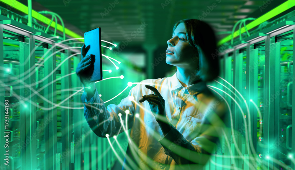 Woman with tablet in data center surrounded by digital network connections, managing servers and cloud computing technology. Information Technology. #1733144130