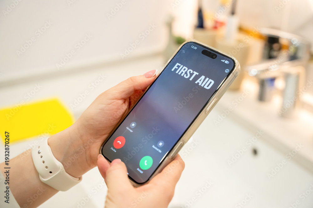 Women calls emergency services. Urgent medical attention needed. What to do in an emergency before paramedics arrive. First aid response and life saving steps during a critical situation at home #1932870267