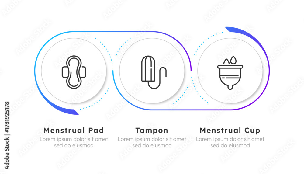 Women hygiene supplies infographic blue gradient line circles. Menstrual products. Period care. Editable thin line icons diagram process with 3 steps. Montserrat-SemiBold, Regular fonts used #1781925178