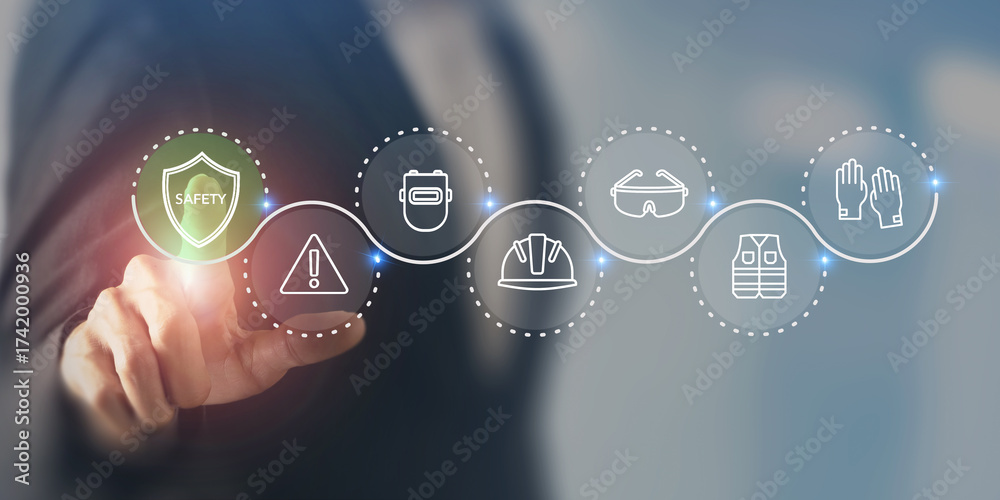 Workplace Safety Concept. Virtual interface displaying safety related icons; a shield, warning sign, hard hat, goggles, gloves and vest. Enhancing workplace safety, hazard prevention, PPE management. #1742000936