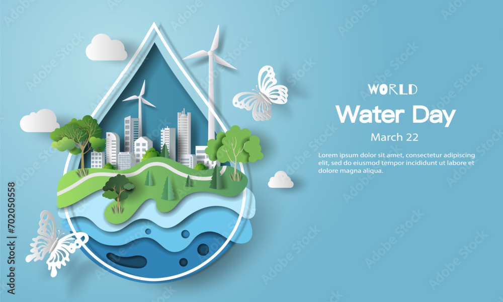 World Water Day, save water, a water drop a city inside. Paper illustration and 3d paper. #702050558