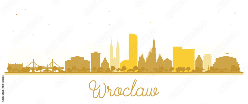 Wroclaw Poland City Skyline silhouette with golden buildings isolated on white. Illustration. Wroclaw Cityscape with Landmarks. Business Travel and Tourism Concept with Historic Architecture. #1754018386
