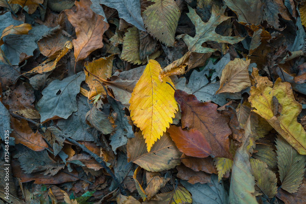 Yellow autumn leaf over dark fall leaves. Concept background #1754841325