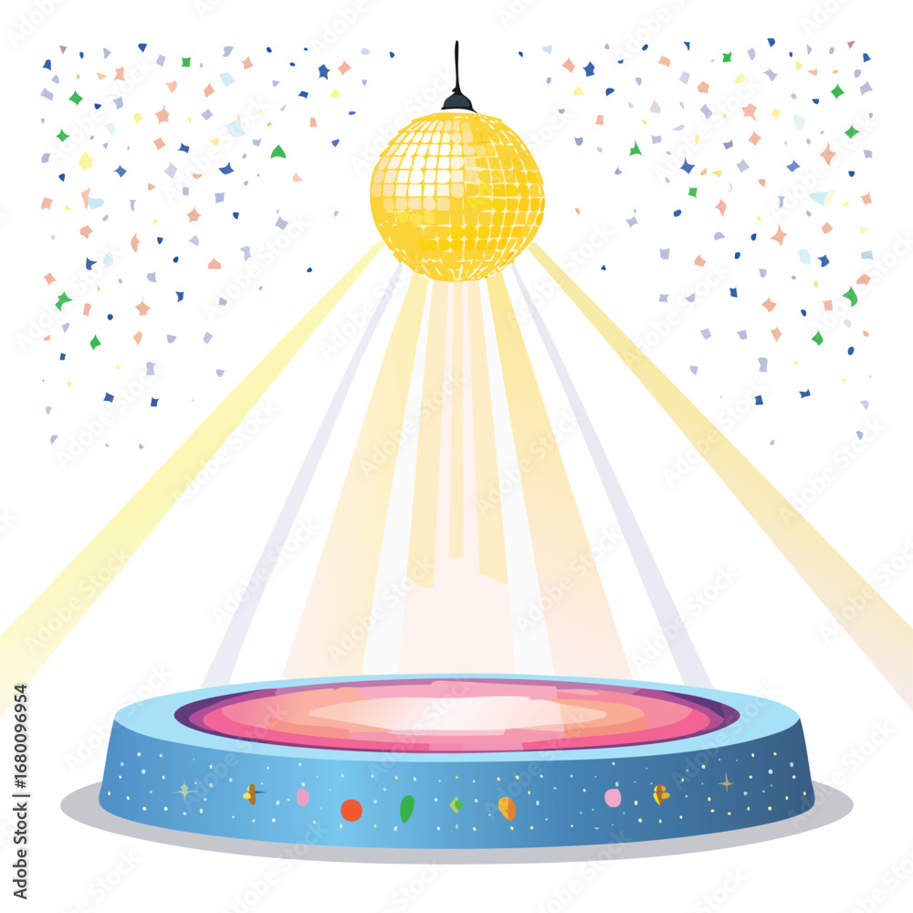 Yellow disco ball shining light on a decorated blue podium with confetti party celebration #1680096954