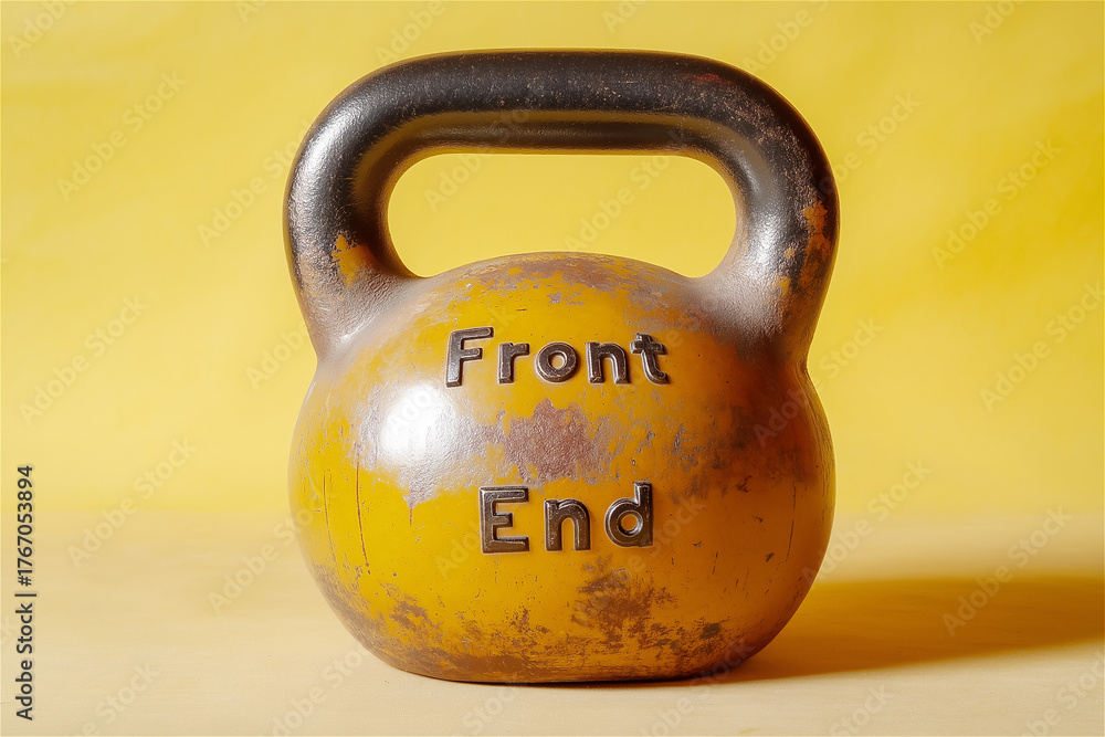 Yellow kettlebell on plain golden background with front marking visible. Fitness weight equipment presented in minimalist style with copy space for strength training or workout concept. #1767053894