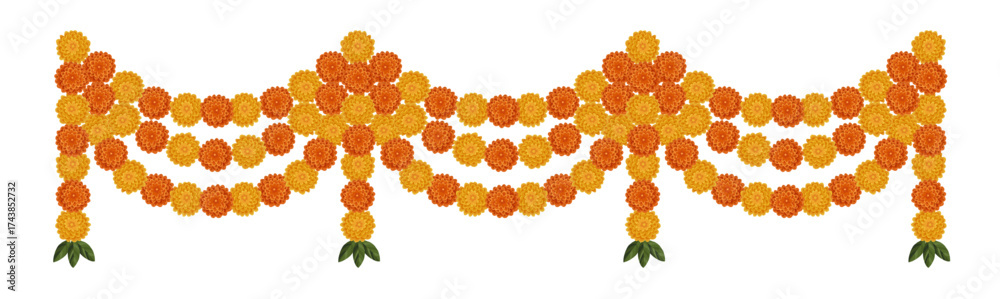 Yellow orange marigold flowers. Indian traditional floral festive garland toran. Zendu flowers isolated on background Party decor. Diwali, Halloween Dia de los Muertos holiday vector illustration #1743852732