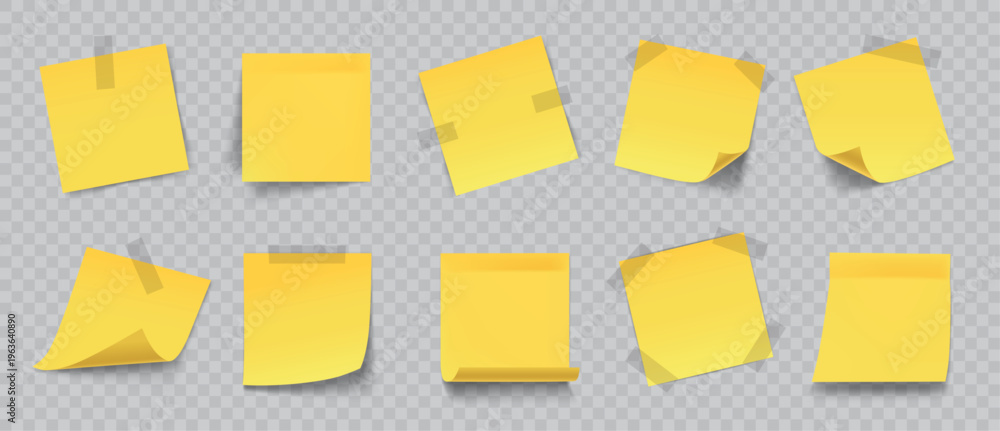 Yellow paper notes. 3D realistic sticky notes, blank memo papers for reminders, office messages organization. Vector isolated set #1963640890