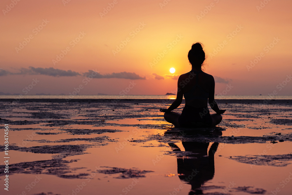 Yoga, Silhouette of woman meditating in lotus pose on beach at sunset, mindfulness and wellness concept #1963474561