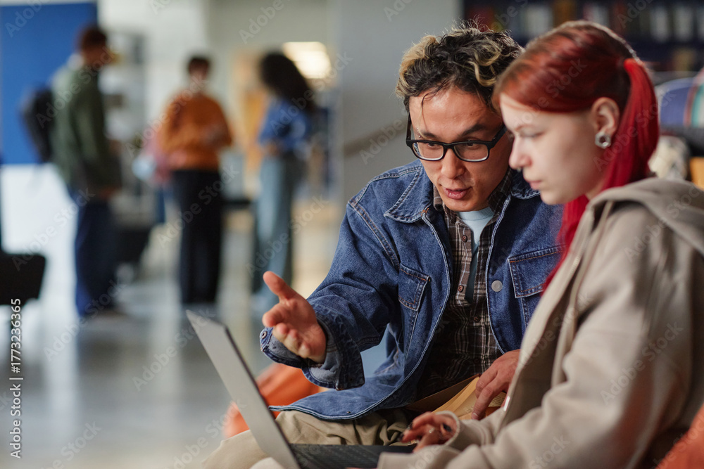 Young adult Asian man explaining something to young adult Caucasian woman using laptop in modern open space, both focused on screen, people visible in blurred background #1773236365