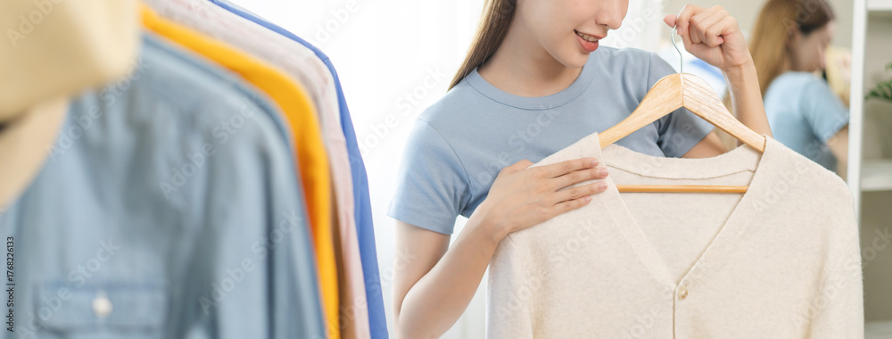 Young asian women looking at mirror choose outfit before go out at home. #1768226133