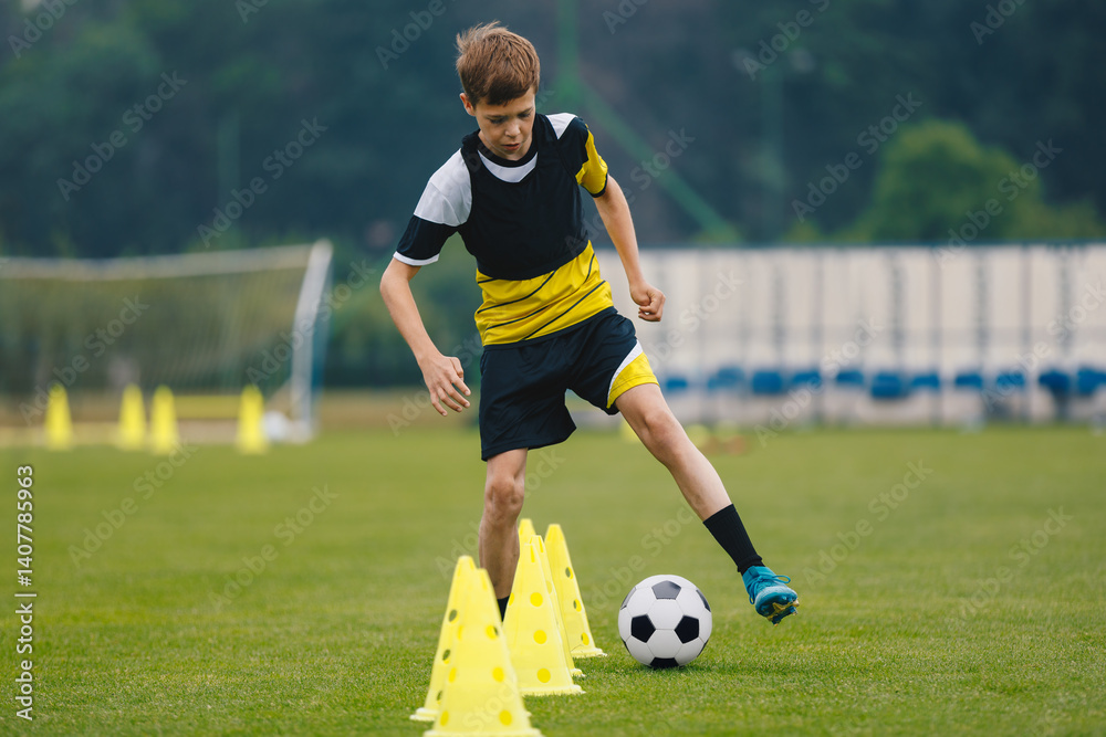 Young Football Player Dribbling Ball Around Training Cones. Soccer Practice For Youth. Soccer Training Facility For Teenage Soccer Team #1407785963
