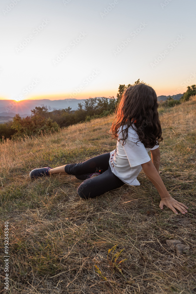 Young girl relaxing in a mountain meadow at sunset #1952345340