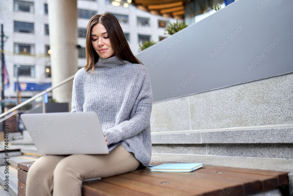 Young happy business woman worker or student working on laptop computer outdoors in campus area. Professional businesswoman employee sitting on bench relaxing browsing internet learning online. #1774040831