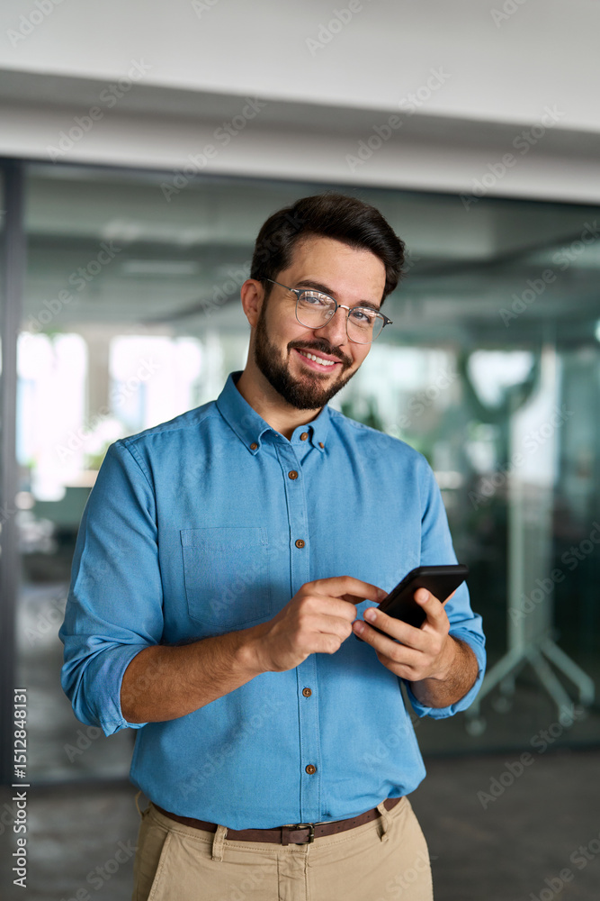 Young happy businessman using smartphone looking at camera using cell phone tech at work. Smiling busy professional business man worker standing in office holding mobile cellphone. Vertical portrait #1512848131
