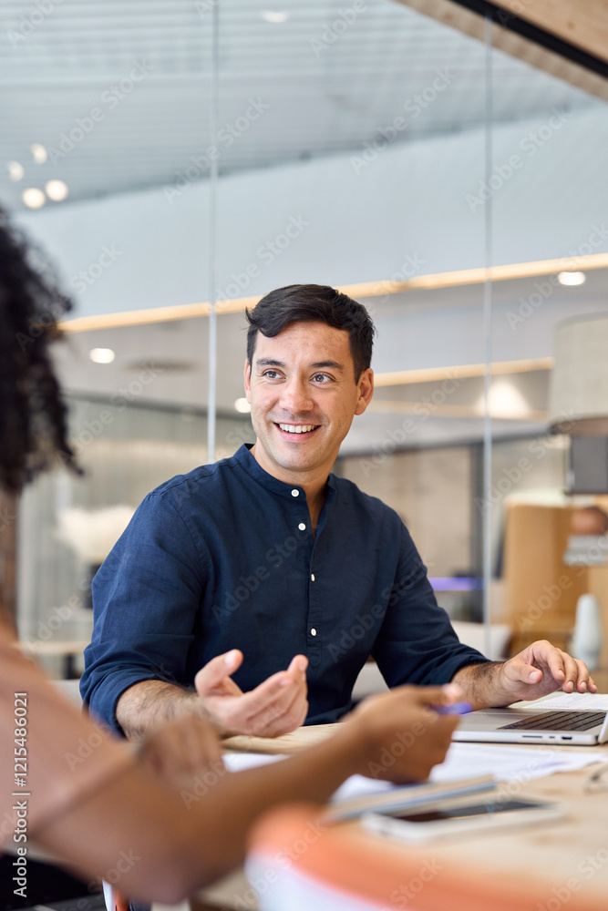 Young professional Hispanic business man manager talking to female colleague or consulting client at corporate meeting. Busy business team people working together using laptop in office. Vertical #1215486021