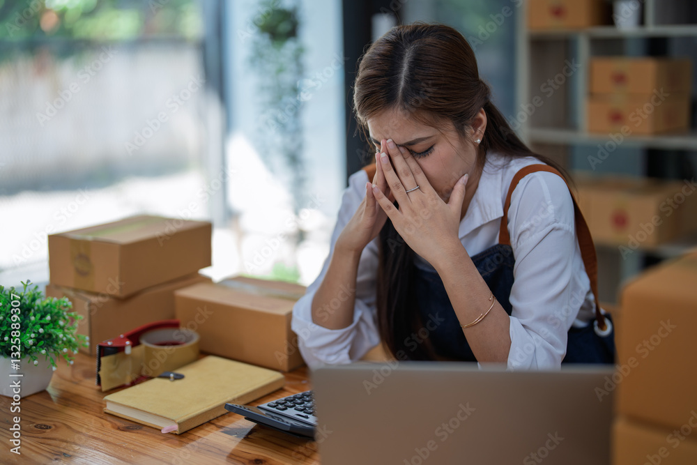 Young woman engaged in online business with stress thoughtful within data products Sales did not meet target Selling products of This month #1325889307