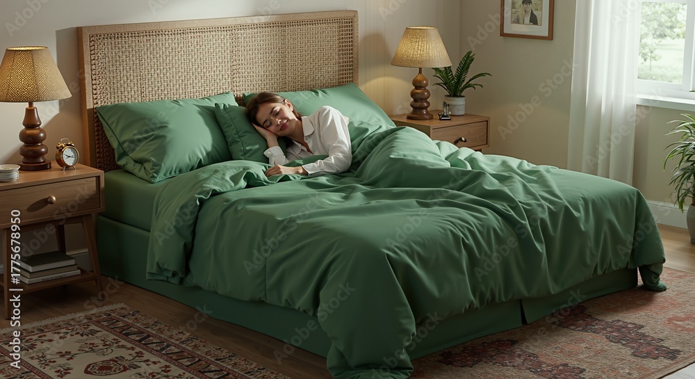 Young woman sleeping comfortably in cozy bed with green bedding. Rest and relaxation in stylish bedroom interior #1775678950
