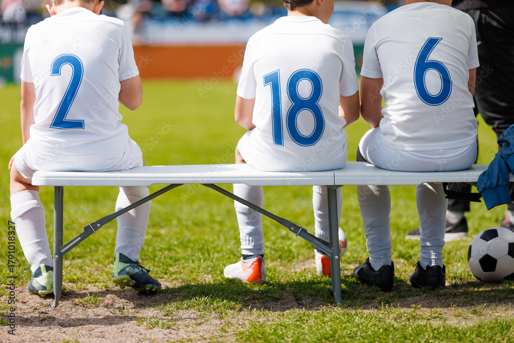 Youth Soccer Substitutes – Kids Sitting on Bench During Football Match. Junior Sports, Team Spirit, and Game Preparation #1791018327