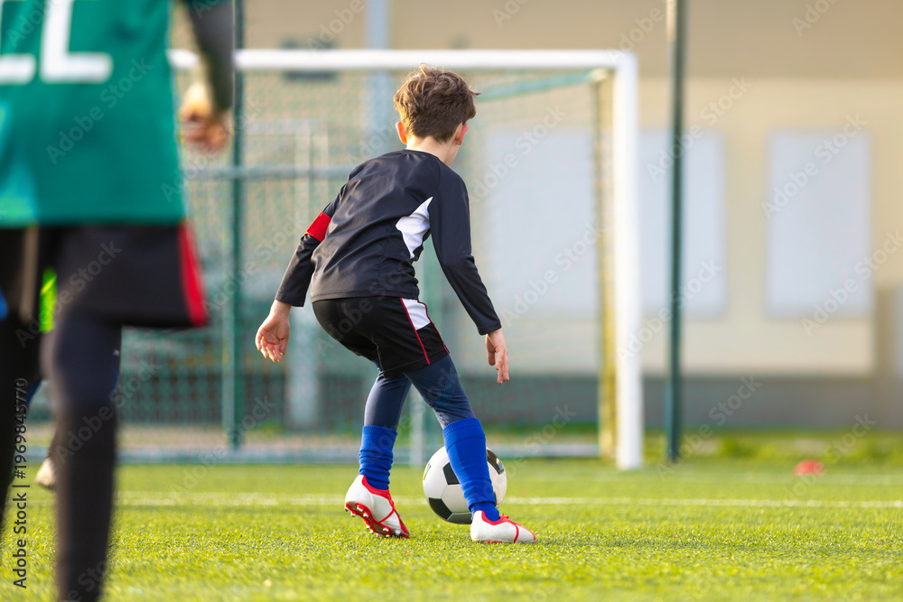 Youth Soccer Training Near Goal; Kid Practicing Dribbling with Coach on Football Field #1969845770